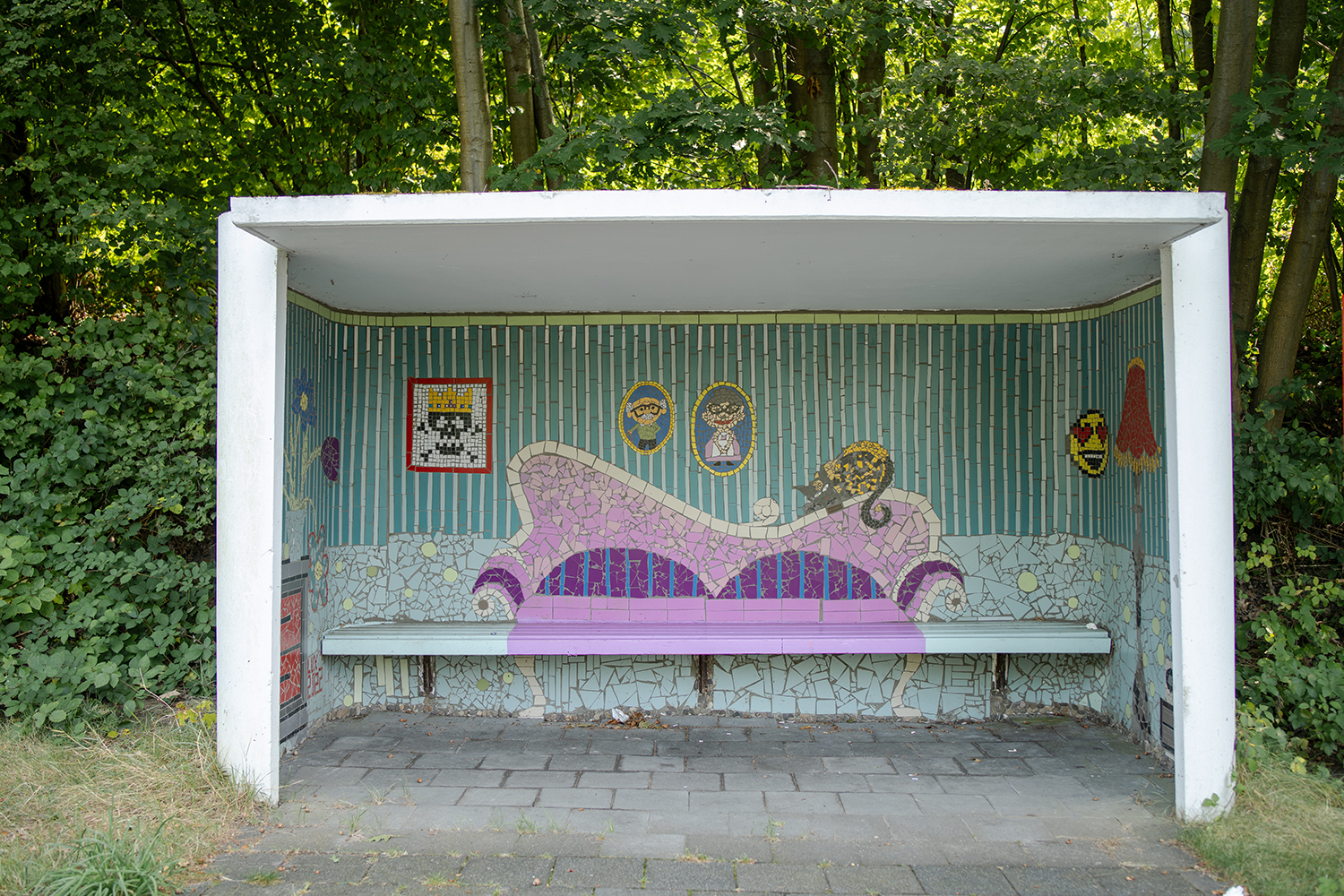 Entstanden ist dieses Mosaikbild während eines Osterferien-Workshops im städtischen Jugendzentrum Lux. Neun Kinder im Alter von acht bis zwölf Jahren haben unter Anleitung der Künstlerin Sarah Rose kiloweise Fliesen zerschlagen und in mühevoller Kleinarbeit zu einem wahren Kunstwerk zusammengesetzt. So entstand im Wartehäuschen ein gemütliches Wohnzimmer mit einem eleganten Sofa in der Mitte, einer Stehlampe und einem Schränkchen mit einer Blumenvase rechts und links davon und vielen anderen kleinen Details.